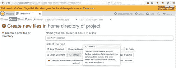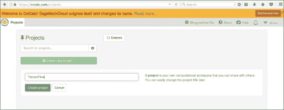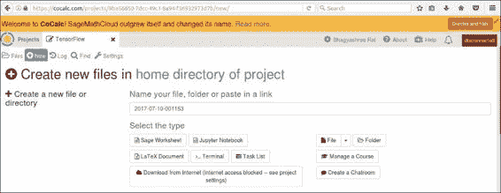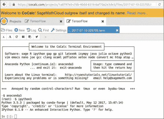 如果您没有计算机的管理或安装权限,但仍然想尝试 TensorFlow,则可以尝试在 CoCalc 实例中通过 Web 运行 TensorFlow。 如果转到 cocalc.com 并创建一个新帐户,则可以创建一个新项目。 这将为您提供一种可以玩耍的虚拟机。 方便的是,TensorFlow 已经安装在 Anaconda 3 内核中。