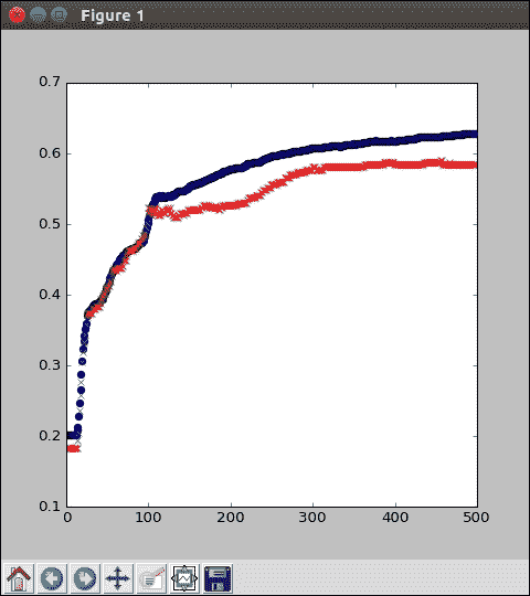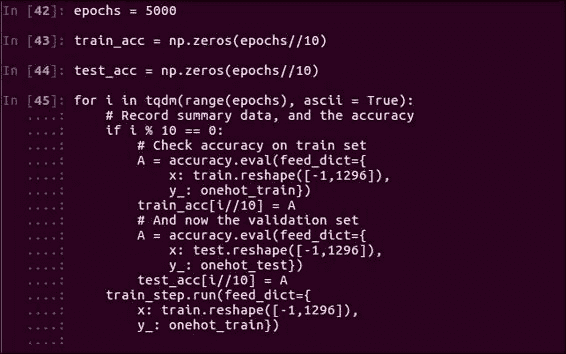 该模型具有36x36像素,外加 1 个偏移乘以 128 个节点,再加上 128 个隐藏节点加上 1 个偏移乘以 5 个类的总权重,即 166,661 个参数。 隐藏层使用sigmoid激活函数来实现非线性。 在经过 5,000 个周期后,参数的纠缠达到了约 60% 的验证准确率,这是一个很大的改进。 但是,此改进的代价是大量增加了计算复杂性中的参数数量,您可以从代码中大致了解一下: