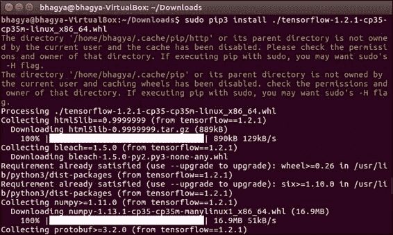 sudo pip3 install ./tensorflow-1.2.1-cp35-cp35m-linux_x86_64.whl我们可以看到这很好。 现在,您已经安装了 TensorFlow。