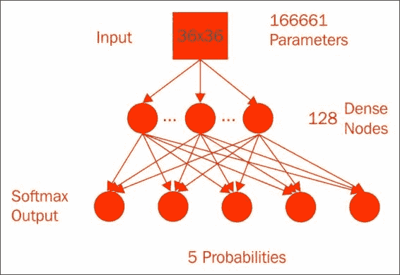 我们的下一个模型是具有最终 Softmax 激活层的单个隐藏层密集连接的神经网络,等效于逻辑回归: