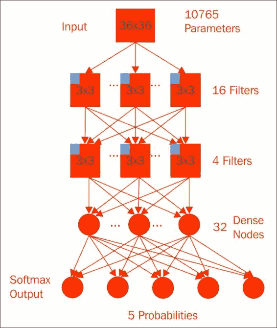 重复出现的局部特征应该是您模型的重要线索。 我们使用卷积神经网络捕获了其中一些局部特征。 我们从一个卷积层开始,一个5x5窗口,使用整流线性单元,通过四个额外的偏项计算四个特征,并提取了有趣的局部参数。 接下来,我们将2x2的最大池化层应用于每个特征,从而将中间值的数量减少到18x18x4加上 1 个偏差。 将其平整为 1,297 个数字,并放入一个密集的神经网络的 32 个节点,然后进行 Softmax 激活,从而完成了具有 41,773 个参数的模型。