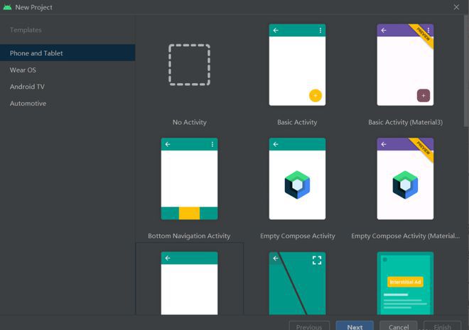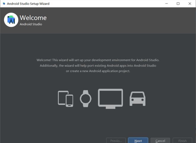 勾选Start Android Studio选项点击Finish启动软件,首次启动界面如下图所示。