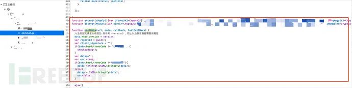 ajax请求函数postData:全局搜索postData函数,最终在common.js找到。在发送请求中发现加解密函数:加密函数encrypt和解码函数decrypt。