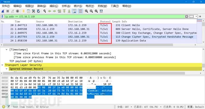由此可知,其实在WindowsServer2008及以上系统,默认RDP就支持加密,差别就是加密长度和加密算法不同,至于采用何种算法,网上也没有统一的答案,抓包也没有发现,猜测可能是RC-4,如果是Windows10客户端连接WindowsServer2008,默认配置下使用的是TLSV1.0协议进行加密,如下图: