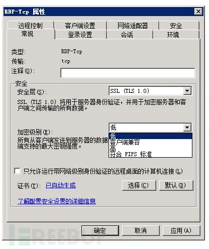 1)Windows远程桌面RDP是否符合传输过程中的保密性?笔者查过相关资料,Windows的RDP安全主要有安全层和加密级别两个参数,其中安全层有RDP安全层、协商和TLS1.0共3个值,其中默认值是协商,