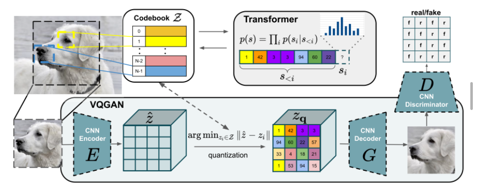 前面也提到,对于图像的编码和解码,作者使用VQGAN。VQGAN的目标是将一幅图像编码成一系列离散的 token,这些 token可用于transformers模型。