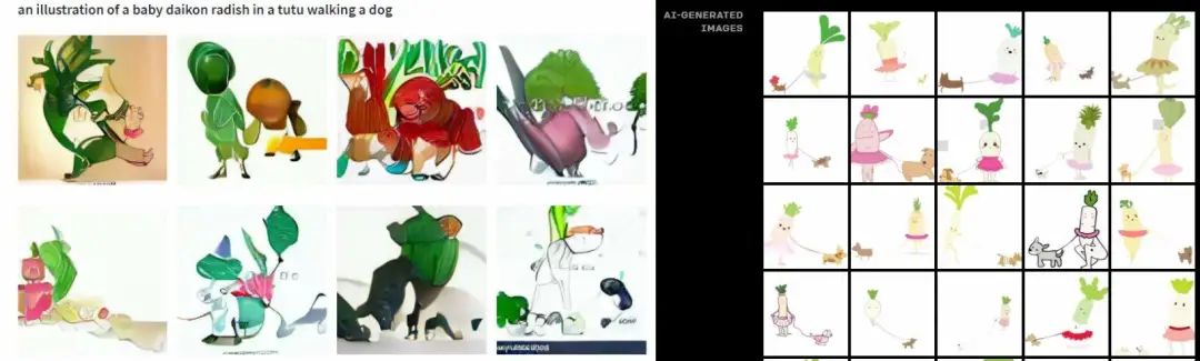 图注:左边为DALL·E mini输出结果,右边为OpenAI官方博客中的示范
