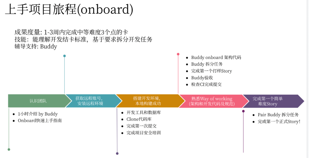 Onboard的流程是以终为始的拉动式学习,旨在帮助团队新人刻意练习来完成快速上岗。通常,TL 或者 Senior Dev 需要为团队新人的On Boarding 准备材料,其中主要包含业务背景介绍、架构设计、测试策略、用户故事和上岗的胜任要求。准备好相关材料后,安排一位Buddy 对新人进行 On Boarding和有结构的学习,完成第一个用户故事的编写,并通过上岗胜任练习后,即可融入团队开发节奏。