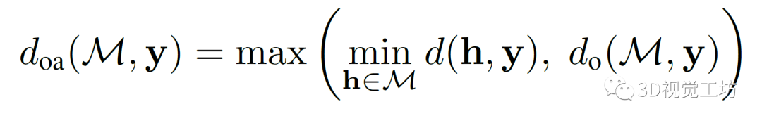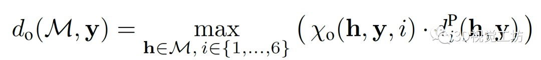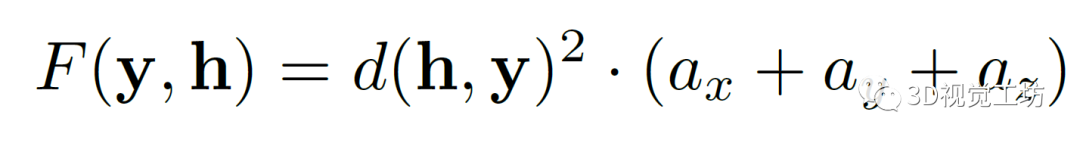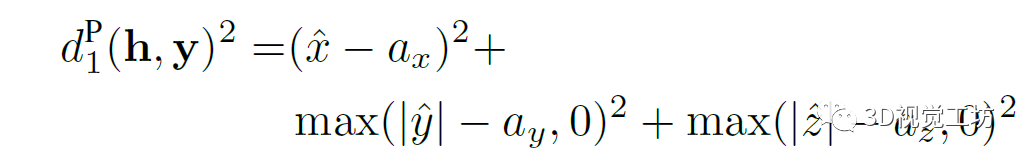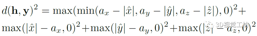 点到立方体的距离。在计算点y=(x,y,z)T和立方体h=(ax,ay,az,R,t)之间的距离时,作者首先将y转换为以立方体为中心的坐标系:y^=R(y-t)。然后计算它到立方体表面的平方距离:。