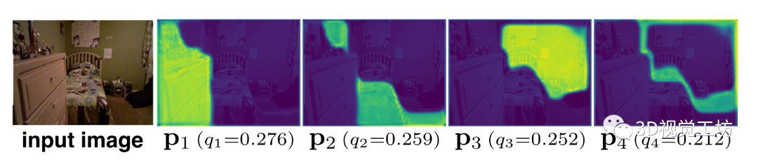 图5 采样权重:对于每张图像,预测多组采样权重 Q = {p1, . . . ,pQ}和相应的选择概率q= [q1, . . . ,qQ]。在这个例子中,前三个采样权重集大致覆盖了场景的不同部分。第四组 p4 没有覆盖大部分场景,但其被选择的概率也最低。