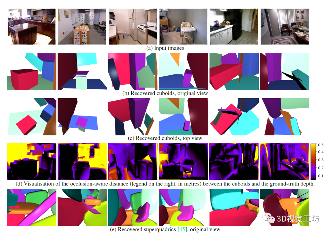 图7 定性结果。第一行:RGB输入图像。第二行和第三行:使用提出的方法获得的立方体(分别与原始图像和俯视图相同的视图)。颜色代表选择立方体的顺序,分别为:红色、蓝色、绿色、紫色、青色、橙色。覆盖大部分图像的立方体通常优先选择。第四行:立方体与真实深度之间的OA-L2距离。较大的距离是由于缺少或遮挡立方体。最后一行:超二次曲线结果。该方法获取的抽象基元非常混乱,几乎不能代表原始场景。作者提出的算法可以推断出更紧密地代表原始场景的抽象基元。