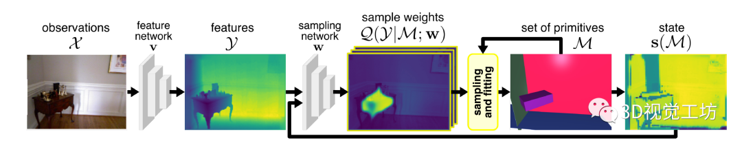 图3 方法概述:给定观察值X(RGB图像),本文使用参数为v的神经网络预测3D特征Y(深度图)。对于每个特征y∈Y,以状态s为条件,参数为w的第二个神经网络预测采样权重p(y|s;w)∈Q。使用这些权重,基于RANSAC的估计器对最小的特征集进行采样,并生成基元(立方体)假设H。选择最佳假设h^∈H并将其附加到先前的集合中恢复几何基元集M。最后根据M,更新状态s并重复该过程以逐步恢复场景中所有几何基元。