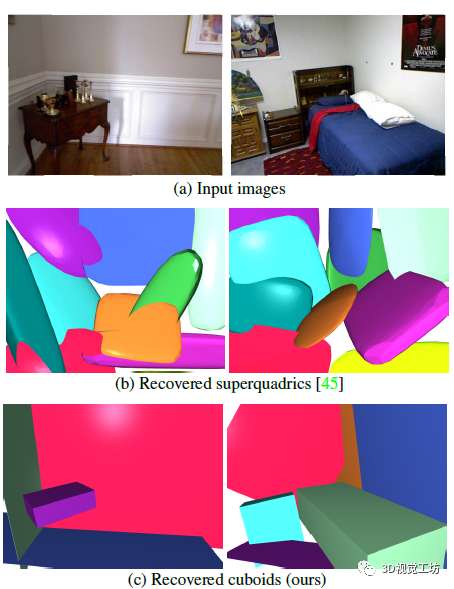 图2 基于几何基元的场景抽象:研究者通过解析现实世界场景的图像(a),使用立方体(c)生成其3D结构的抽象。同时该方法能够比以前基于超二次曲线的工作(b)更准确地捕获场景结构。