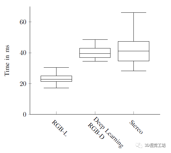 图5比较了三种模式的总运行时间,结果显示使用来自激光雷达的深度图的两种模式都显示出明显较小的差异。RGB-L运行时间的平均值为22.8毫秒,比双目模式的平均值41.2毫秒少40%以上。
