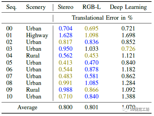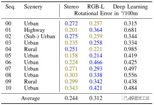 表2 每100米的平均旋转误差。最佳结果以绿色突出显示,次佳结果以蓝色突出显示