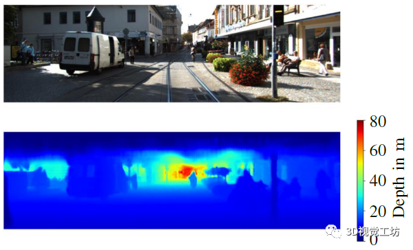 在作者的配置中,网络的平均运行时间为16.32 ms,其中9.66 ms为GPU上的实际计算时间。每个像素的MAE为0.39m,RMSE为1.17m。典型的神经网络高分辨率深度图和对应的相机图像如图3所示。