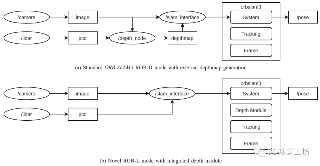 图1 在标准RGB-D模式和新的RGB-L模式下使用基于激光雷达的稠密深度图的ORB-SLAM3