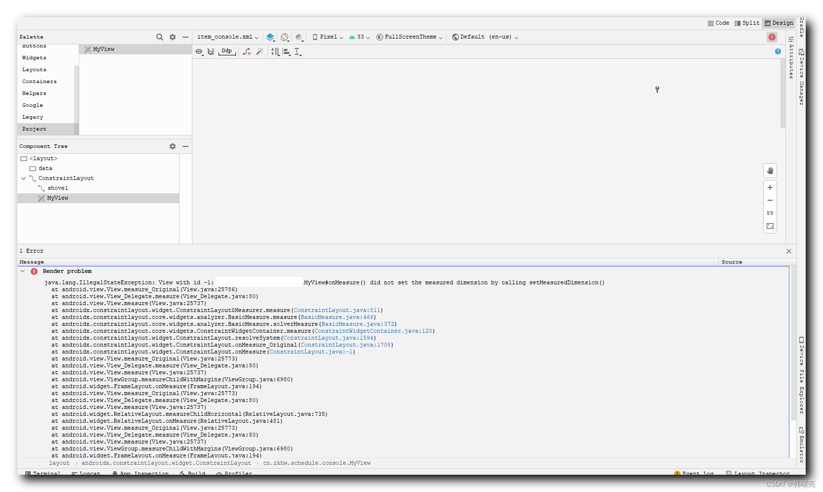 在 ConstraintLayout 约束布局中 , 引入了自定义 View 后 , 整个 Design 图形化操作界面没了 , 报错信息如下 :