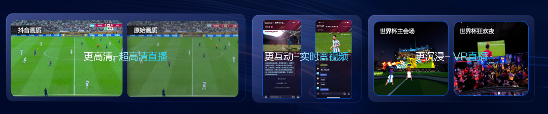 在更高清方面:火山引擎基于自研 BVC 编码器和 AI 技术的智能编码方式,大幅提升了文件压缩率。在高速运动、复杂纹理的场景下,确保直播内容的清晰度和流畅度;还可兼顾码率、延迟等对网络传输层面尤为敏感的指标要求。此外,在火山引擎的支撑下,抖音还实现了业界首次世界杯比赛支持 4K HDR 10-bit 的直播。 在更互动方面:火山引擎通过 RTC 开拓了边看边聊的互动模式,可以让球迷们在最高 500 人内的房间里“云侃球”。在线人数峰值超过 200 万,崩溃率低于十万分之三。火山引擎还采用了 SFU+MCU 融合方案,一方面,可以减少 RTC 系统全链路的并发音视频流数,扩大 RTC 系统并发容量,另一方面,在保证用户可以随时平滑上麦交流的同时,有效降低观赛用户的设备端性能消耗压力,让用户获得最佳的观播互动体验。 在更沉浸方面:火山引擎支持了 PICO 的 VR 直播,将虚拟与现实深度融合。并提供了比 IMAX 屏幕尺寸更“大”的 VR 屏幕,提升用户的沉浸感。