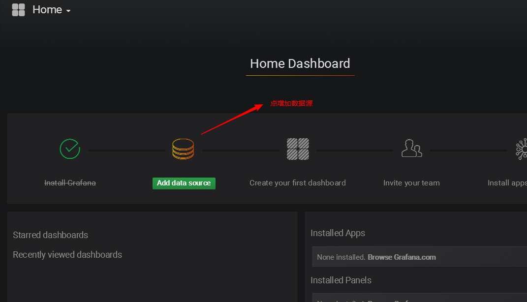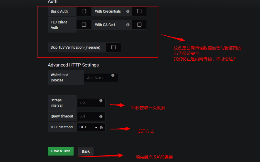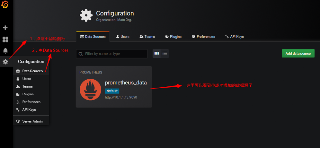 下面我们把 Prometheus 服务器收集的数据做为一个数据源添加到 grafana,让 grafana 可以得到 Prometheus 的数据。