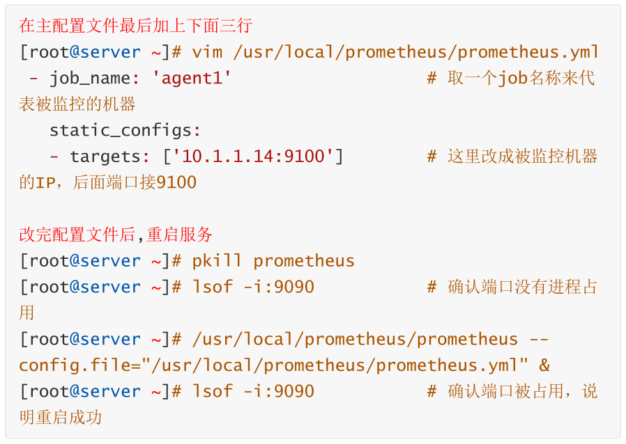 回到 Prometheus 服务器的配置文件里添加被监控机器的配置段: