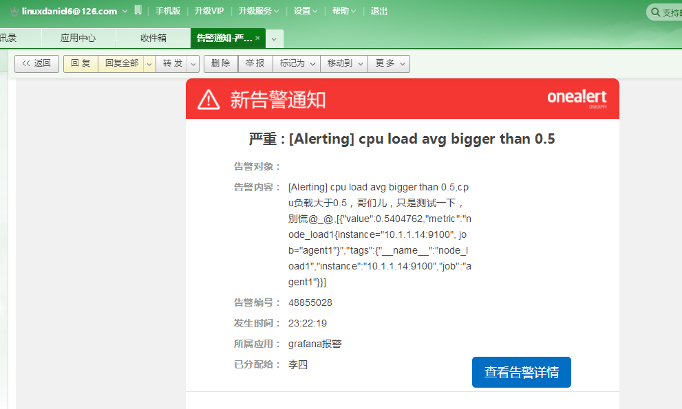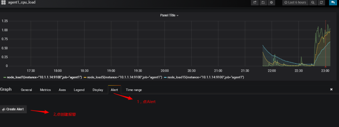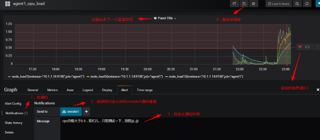 现在可以去设置一个报警来测试了(这里以我们前面加的 cpu 负载监控来做测试):