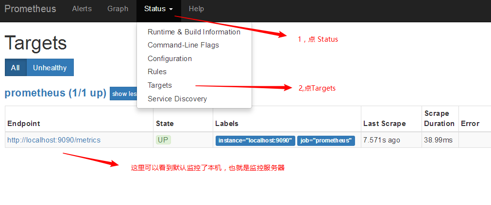 默认只监控了本机一台,点 Status→点 Targets→可以看到只监控了本机: