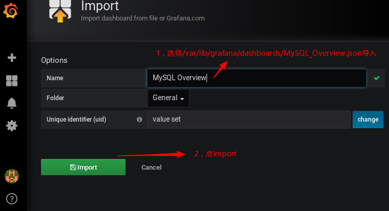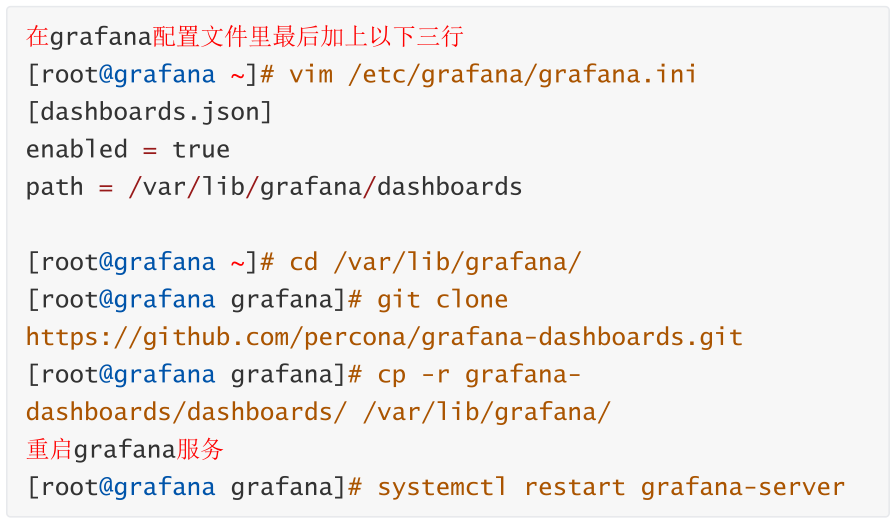 在 grafana 上修改配置文件,并下载安装 mysql 监控的 dashboard(包含相关 json 文件,这些 json 文件可以看作是开发人员开发的一个监控模板)。