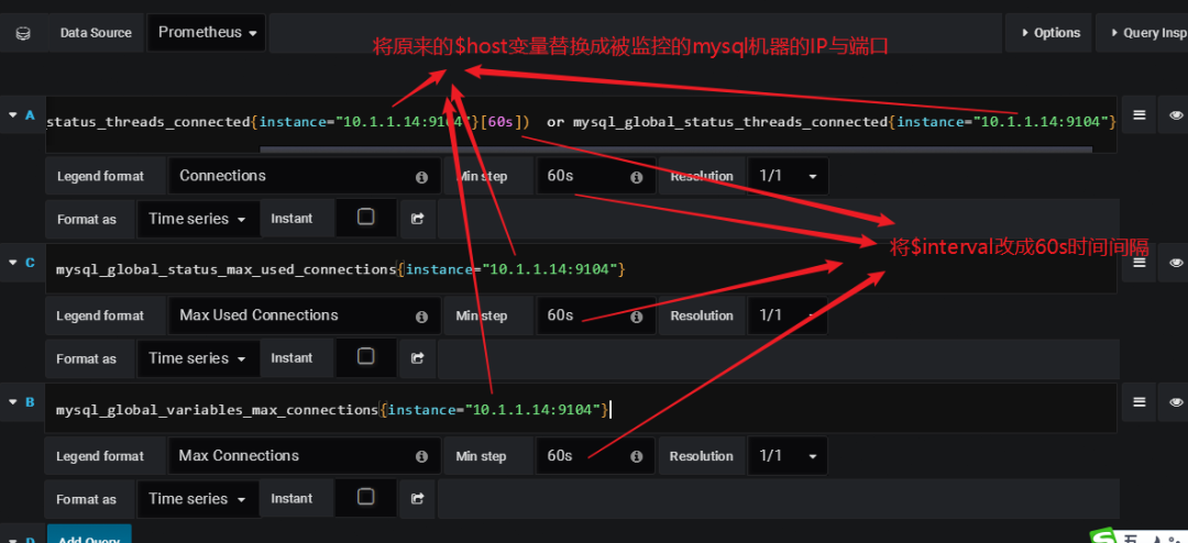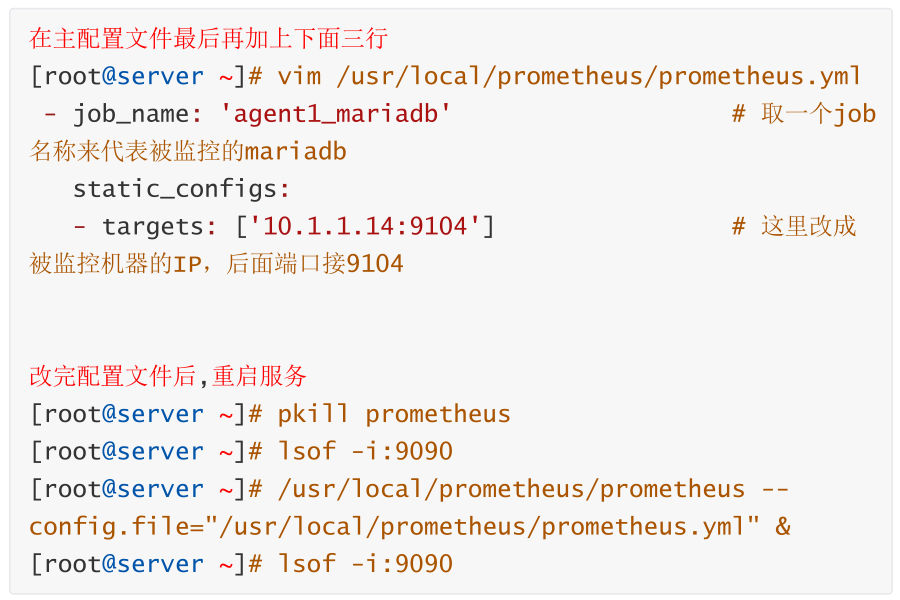 回到 Prometheus 服务器的配置文件里添加被监控的 mariadb 的配置段: