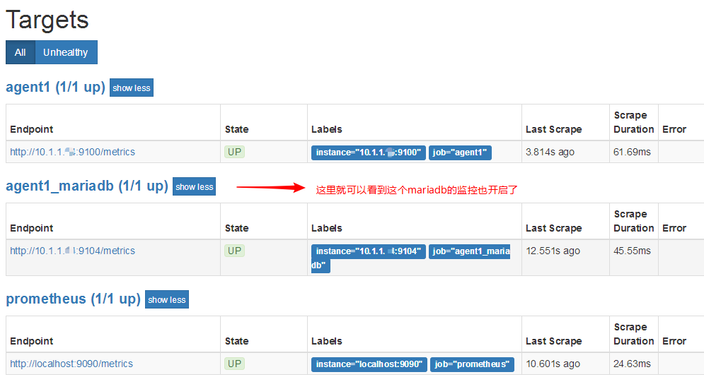回到 web 管理界面→点 Status→点 Targets→可以看到监控 mariadb 了: