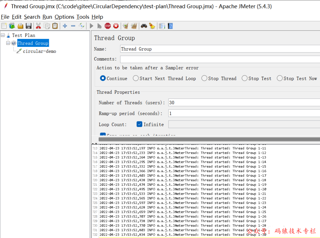 采用 Jmeter 来模拟并发 Client 调用。配置了30 个 线程,无限循环。