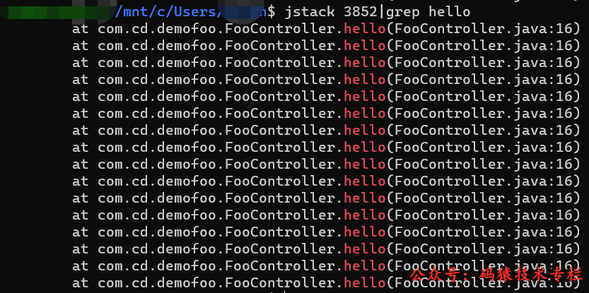 通过 jstack 我们可以看到 Foo 进程的所有线程都卡在 hello() 调用上了。