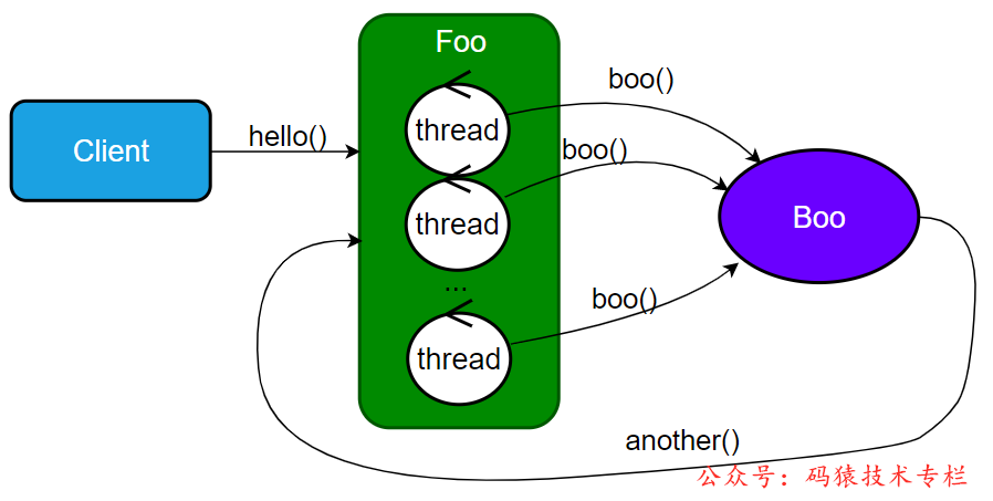 通过这个图示,我们可以发现,如果容器中接收请求的线程池如果都在等待服务Boo.boo() 的响应,而 Boo 又需要调用回服务 Foo.another()。这个时候,如果所有的线程都处于这样的状态,我们就会发现服务 Foo 容器中以及没有线程来处理 Boo 的请求了。关注公众号:码猿技术专栏,回复关键词:1111 获取阿里内部的Java性能调优手册!某种程度上来说就是死锁了。到这里,我们就可以很确定了,这个环形依赖调用就是导致出现调用超时的罪魁祸首。当 client 发起的请求速度大于这个环形调用链的处理速度的时候,慢慢的就会导致服务 Foo 的所有线程都进入这种死锁状态。