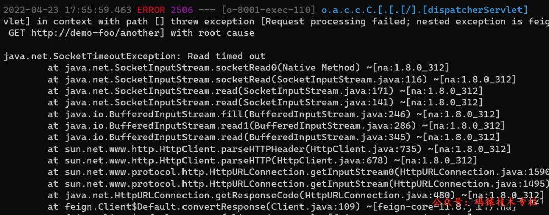 很快服务 Foo 日志就卡死了。过一会 Boo 的日志开始出现 SocketTimeoutException,如下图: