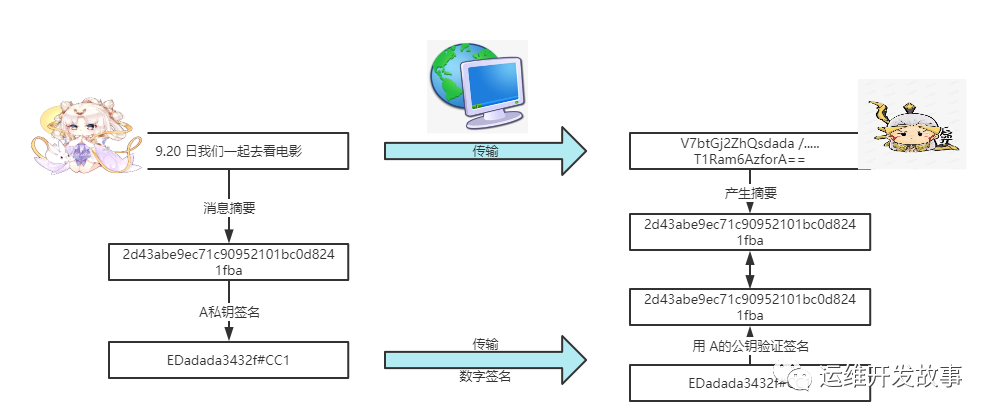 我们还是以嫦娥告诉后羿,“9.20 日我们去看电影”这段信息为例子,说一下数字签名的过程。整体流程如下图所示: