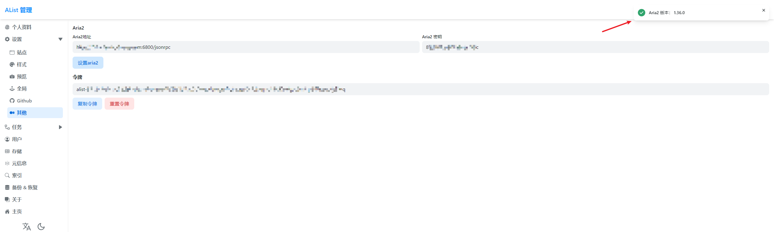 在AList管理设置的其他中,输入之前安装服务的得到的Aria2地址、密钥,点击设置aria2,右上角弹出Aria2版本信息即为设置成功