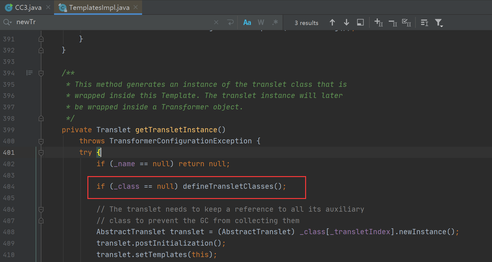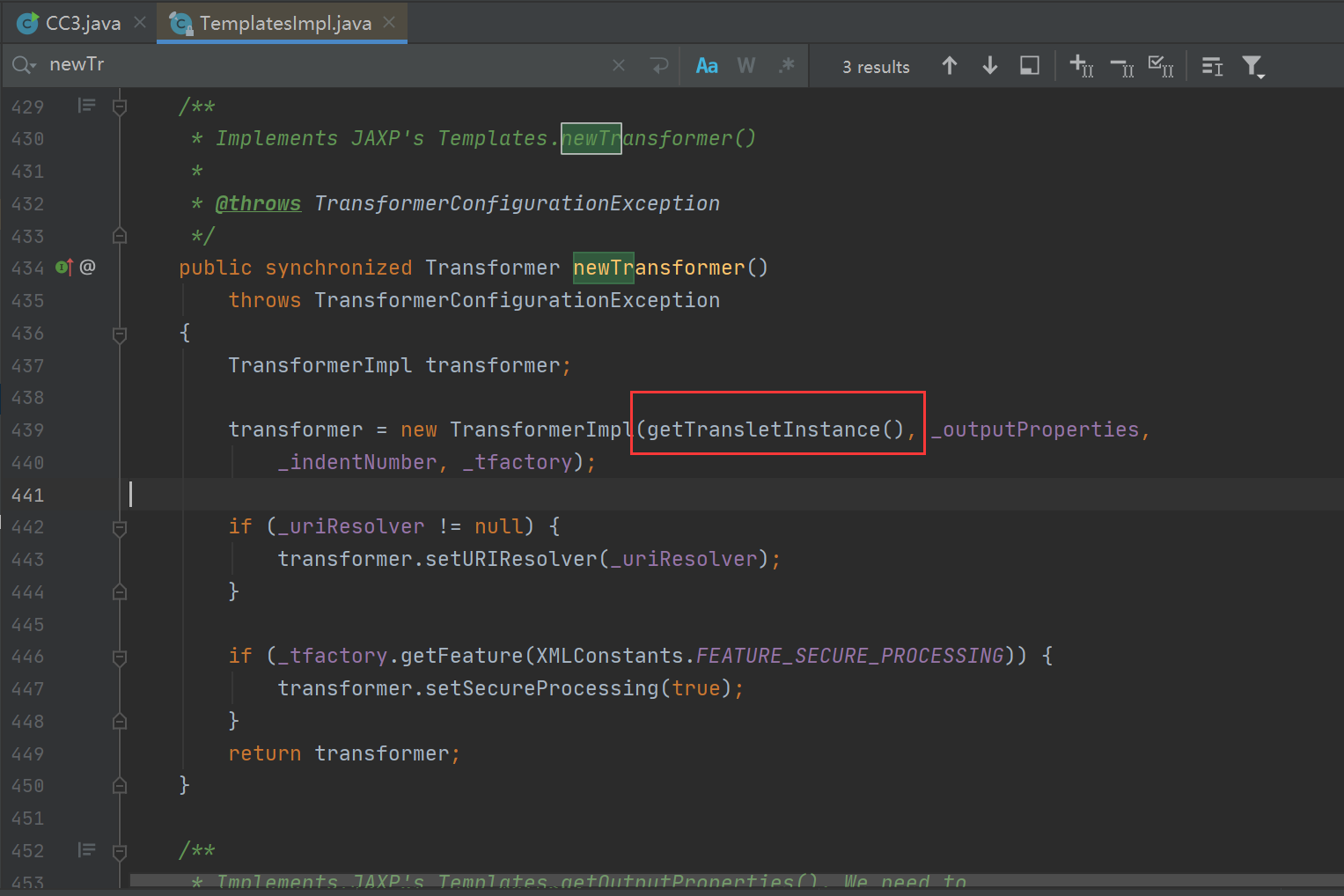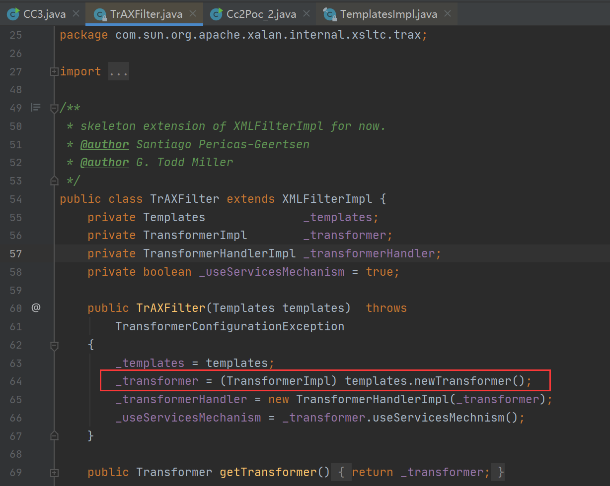 }到这里利用链都是和CC2一致的,到下面的步骤需要寻找调用templatesImpl.newTransformer()方法的类,在ysoserial中CC3使用TrAXFilter类中的构造方法中调用了该方法