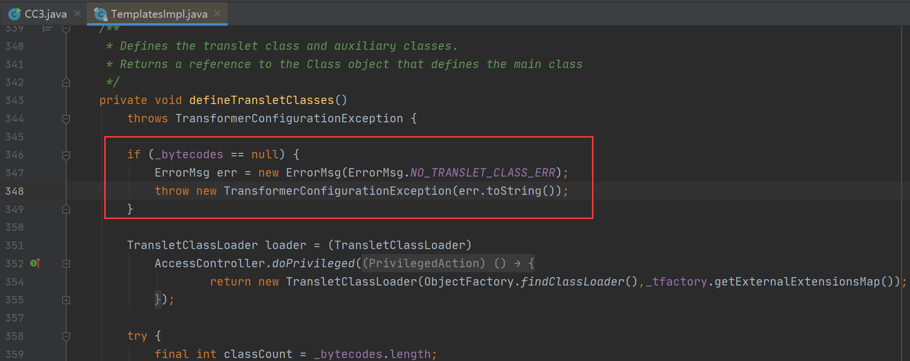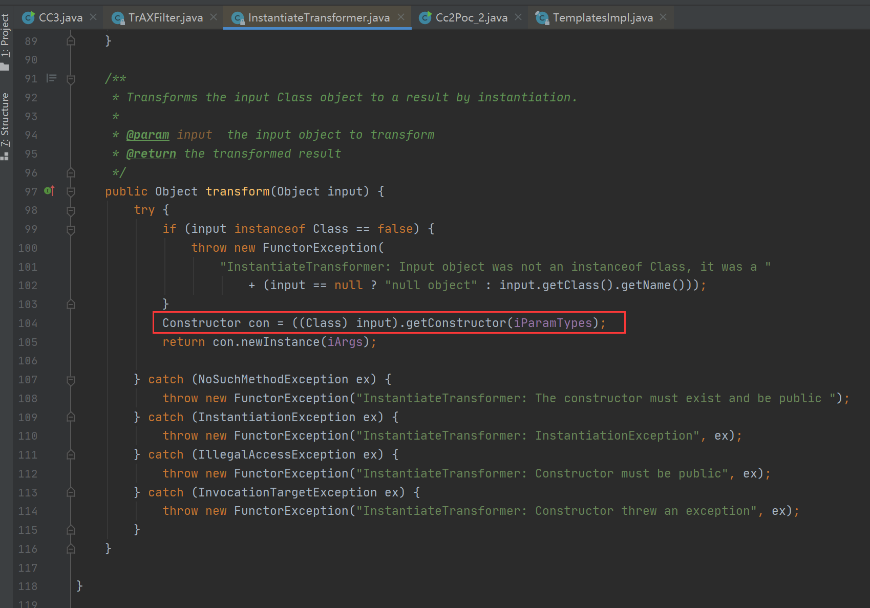 CC3的出现就是在过滤InvokerTransformer类情况下的绕过,CC3使用InstantiateTransformer#transform(object input)方法来绕过该过滤,与InvokerTransformer#transform类似,该方法调用了传入的TrAXFilter类传入的object对象的构造方法