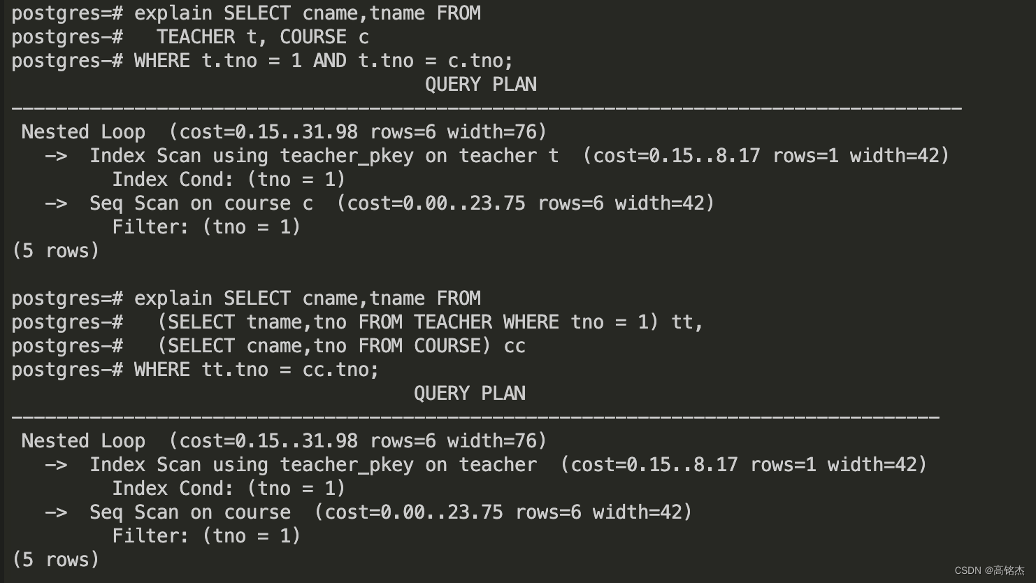 注意这里的course并没有选择条件,但seq scan course的计划中存在tno=1,这就是等价推理。