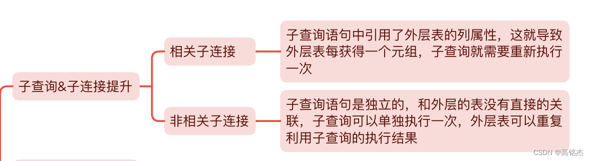 Postgresql中通过子句所处的位置来区分子连接和子查询,出现在FROM关键字后的子句是子查询语句,出现在WHERE/ON等约束条件中或投影中的子句是子连接语句: