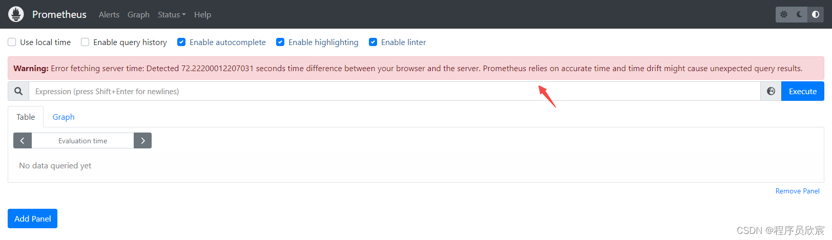 Warning: Error fetching server time: Detected 72.22200012207031 seconds time difference between your browser and the server. Prometheus relies on accurate time and time drift might cause unexpected query results.