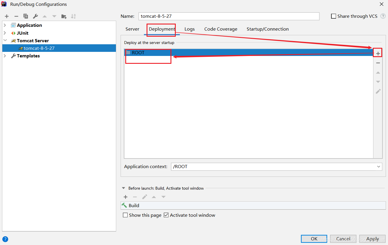 解决方案: 我们在配置好的tomcat的deployment tab页面点击右侧的绿色+号,选择本地tomcat目录下的\webapps\ROOT