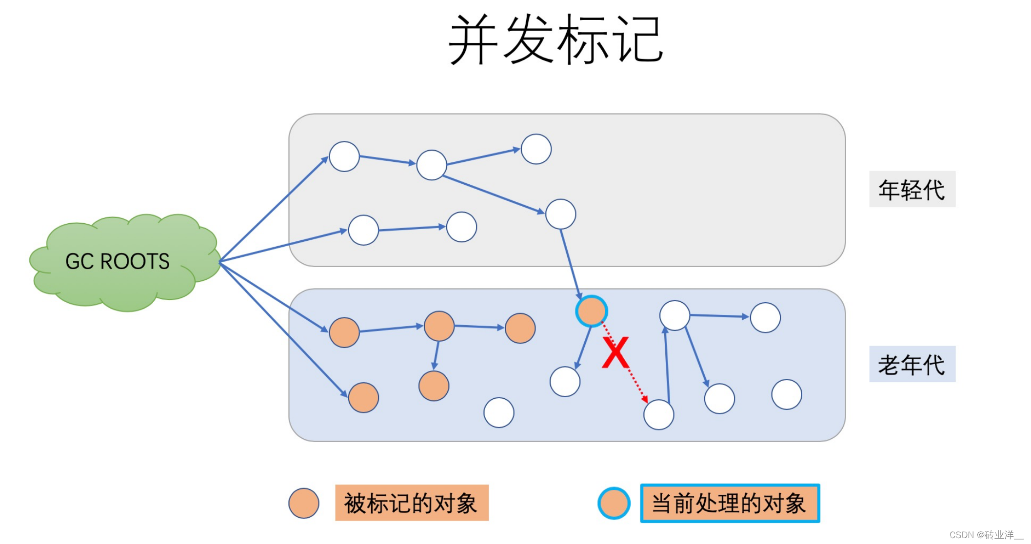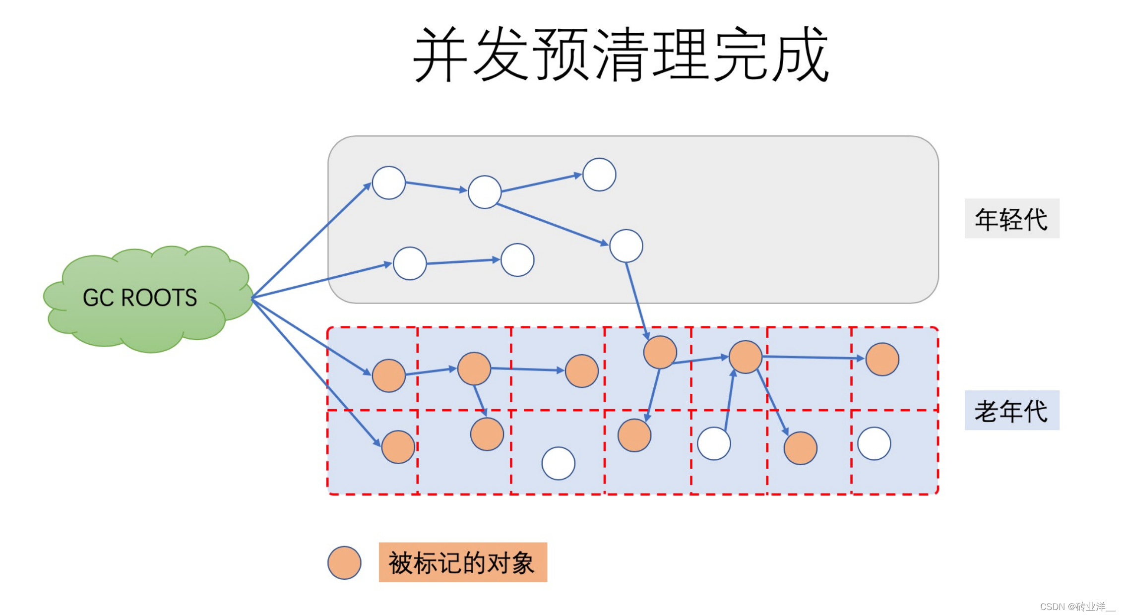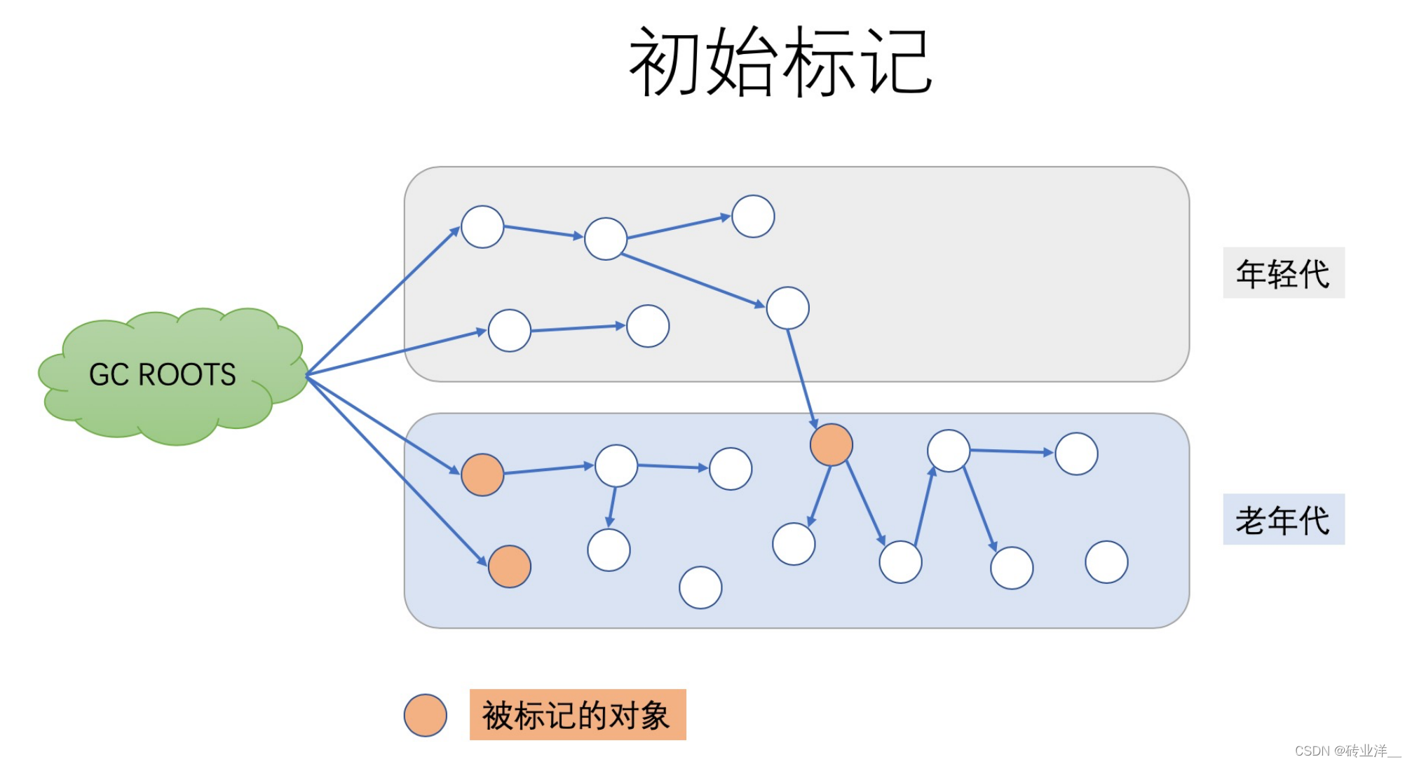 此阶段标记所有从GC根对象直接可达的对象。在CMS中需要一次STW暂停,但G1里面通常是在转移暂停的同时处理这些事情,所以它的开销是很小的。