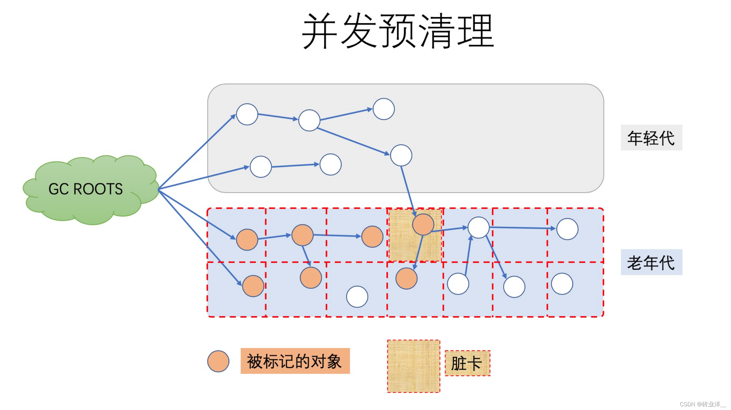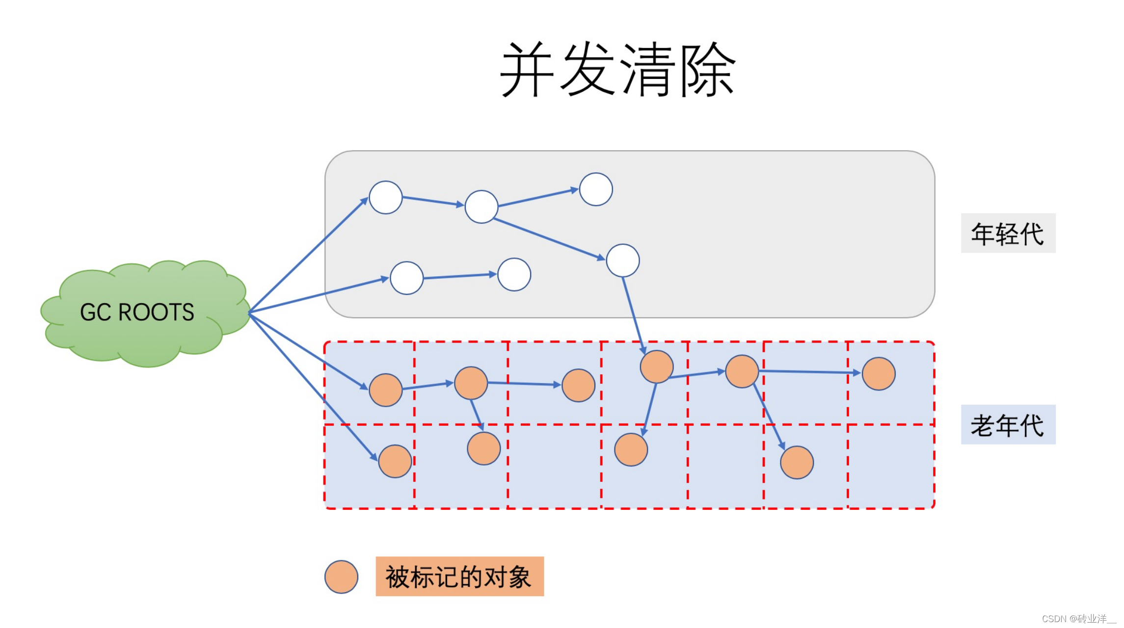 此阶段标记所有从 “根区域” 可达的存活对象。根区域包括:非空的区域,以及在标记过程中不得不收集的区域。