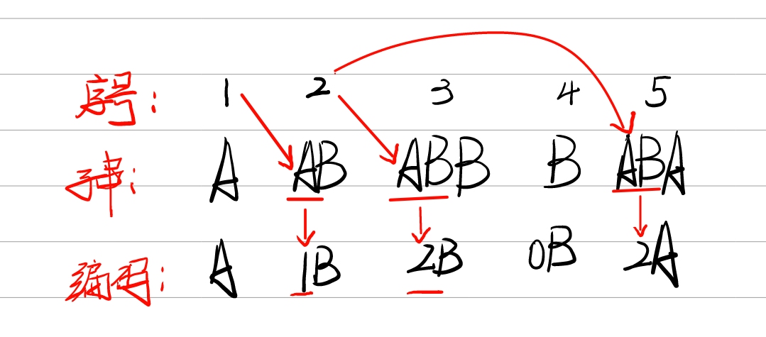 由于序号(index)2的字串AB中有A,可以用A的序号来替换字串A,编码AB为1B。同理,序号(index)3的字串ABB中有最长字串AB,可以用AB的序号替换ABB中的AB,编码为2B。序号(index)4的字串B与前面的字串没有匹配,为空集Ø,编码为0B。序号(index)5的ABA编码为2A。