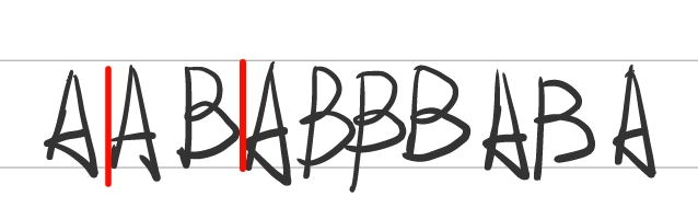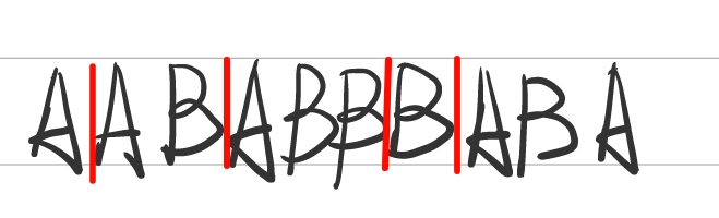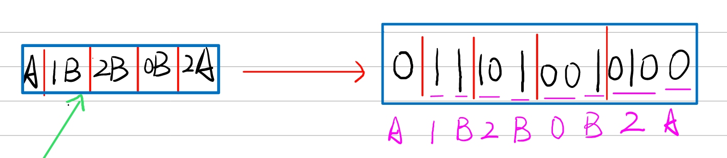 此时,我们就用字典将原来的字串编码成了一个更简单的串,简化了相关变量,此时我们只需要给A和B赋值即可得到最终编码的二进制串。这里假设A=0,B=1。