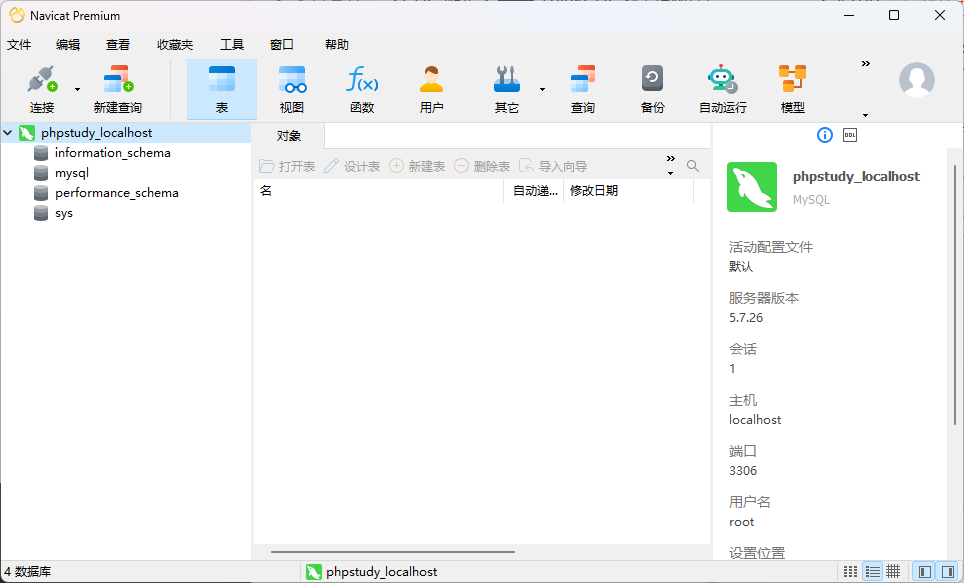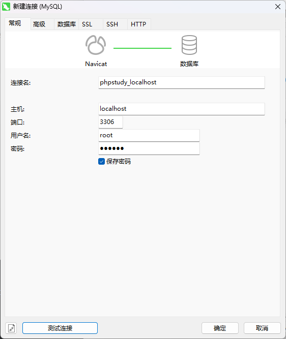 我们这里使用 navicat 进行数据库的连接。输入 phpstudy 数据库中设置的账号密码等相关信息(这里建议输入 root 账号与密码,方便 navicat 连接),点击确认进行连接。