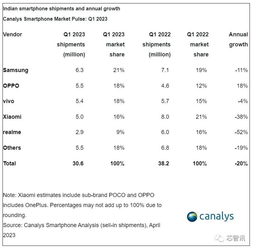 从市场端来看,由于印度政府的打压,以及小米对于印度市场的误判,使得小米手机自去年以来在印度市场的销售受到了较大影响,原本第一位置也被三星超越。根据市场研究机构Canalys最新的报告显示,在2023年一季度,三星以630万部的出货量拿下了21%的市场份额,而小米则下滑到了第四位,出货量仅为500万部。