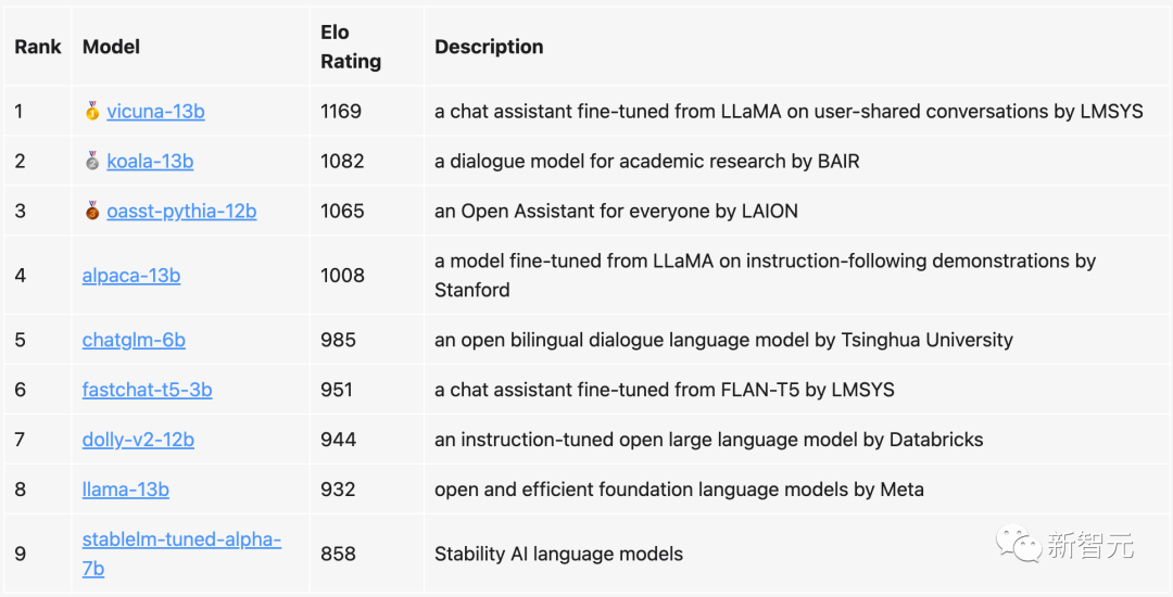 在当前的排行榜中,130亿参数的Vicuna以1169分稳居第一,同样130亿参数的Koala位列第二,LAION的Open Assistant排在第三。