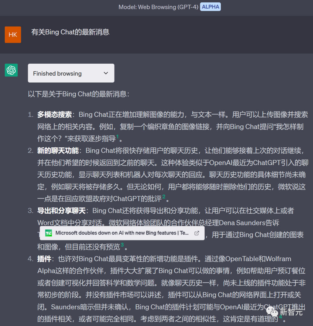 就比如,我们问联网版GPT-4有关Bing Chat地最新消息。